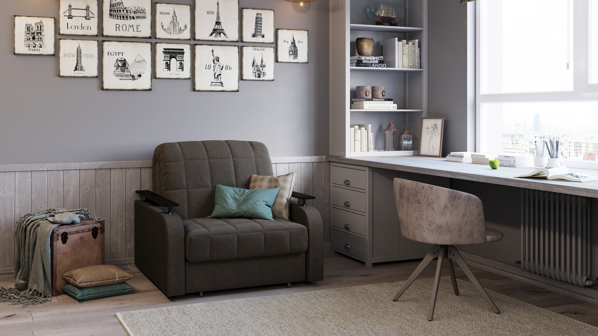 Кресло-кровать MOON FAMILY 044 украшено уютной стежкой в квадрат. Гладкая фактура подлокотников и стежка — эффектный визуальный контраст, добавляющий дизайну привлекательности. Проверенный временем дизайн с приподнятой над уровнем подлокотников столешницей создает пространство, в котором хочется проводить как можно больше времени.