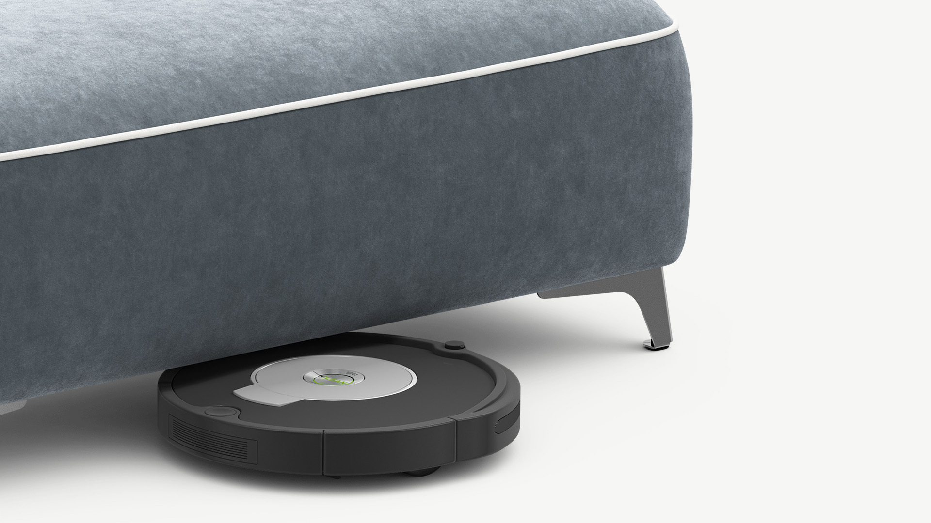 Под банкеткой с высокими фигурными опорами проходит робот-пылесос.
