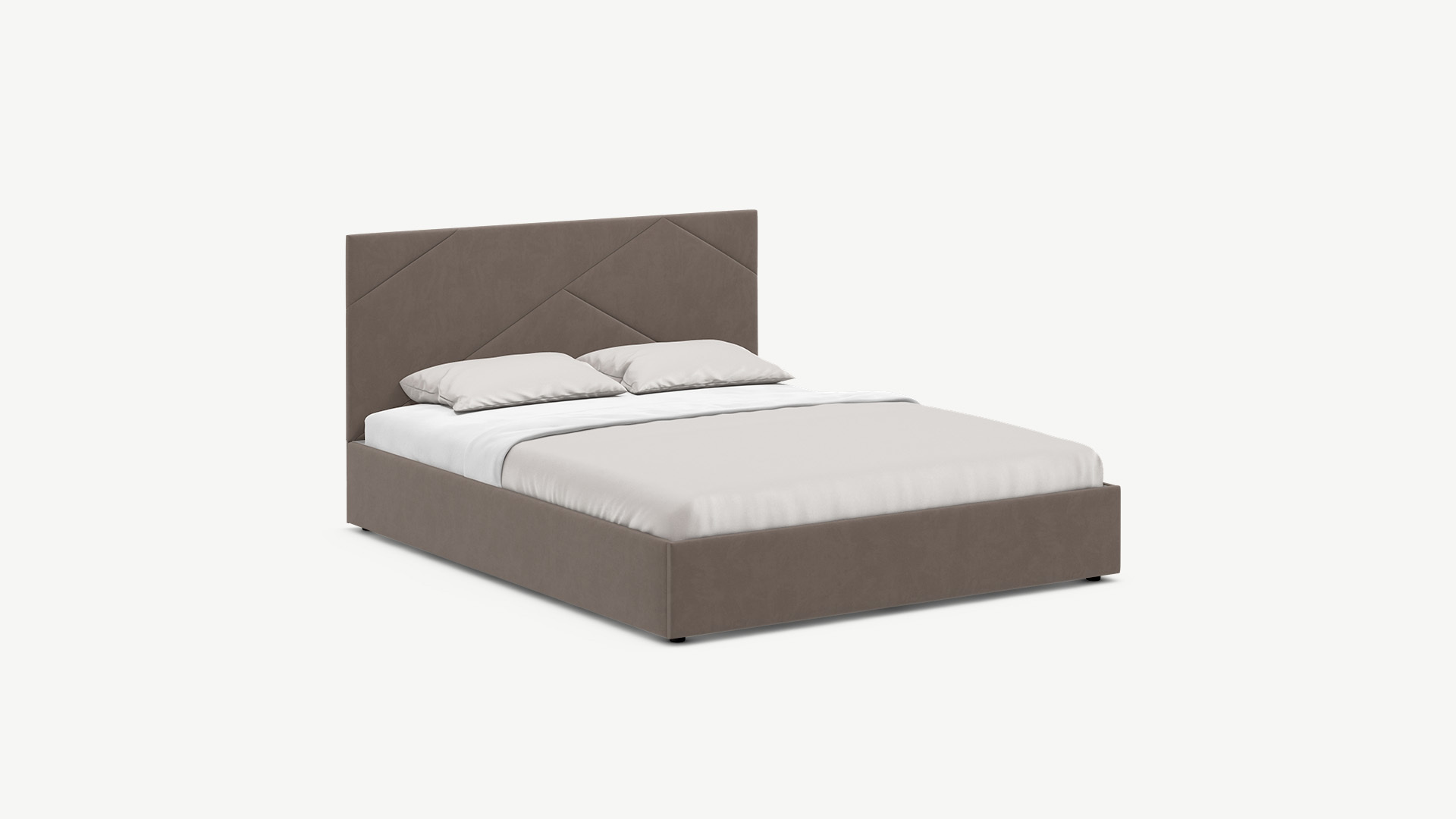 MOON FAMILY 1257 привлекает внимание оригинальным исполнением: широкие полосы ткани эффектно пересекают периметр изголовья, создавая на нем графический орнамент. Элегантным и практичным акцентом служат скрытые карманы, расположенные по его углам. Лаконичные формы объемных царг создают единый гармоничный образ и фокусируют внимание на центральном текстурном элементе кровати.