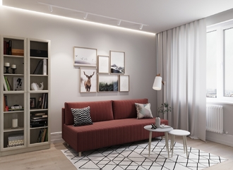 Спинка, выполненная в обивочной ткани, позволяет ставить диван в центре комнаты и зонировать пространство.