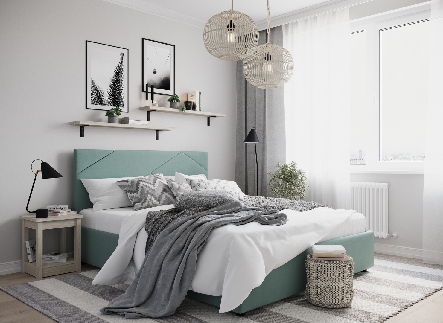 Создать гармоничный интерьер и завершить образ спальни помогут дополнительные аксессуары, например: тумбы, банкетки, подушки.