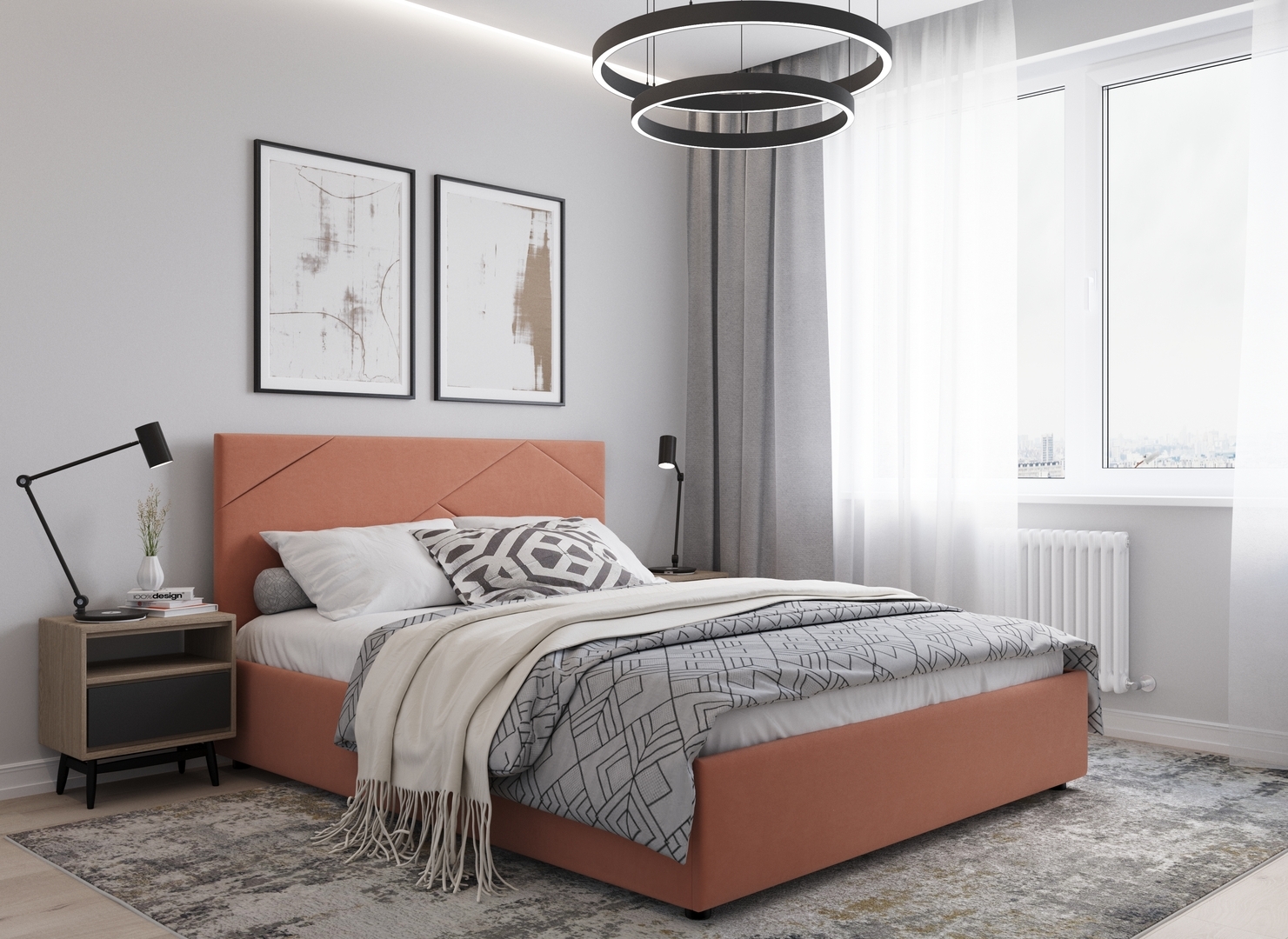 Кровать с подъёмным механизмом с выбором опорMOON FAMILY 1257 привлекает внимание оригинальным исполнением: широкие полосы ткани эффектно пересекают периметр изголовья, создавая на нем графический орнамент. Элегантным и практичным акцентом служат скрытые карманы, расположенные по его углам. Лаконичные формы объемных царг создают единый гармоничный образ и фокусируют внимание на центральном текстурном элементе кровати.