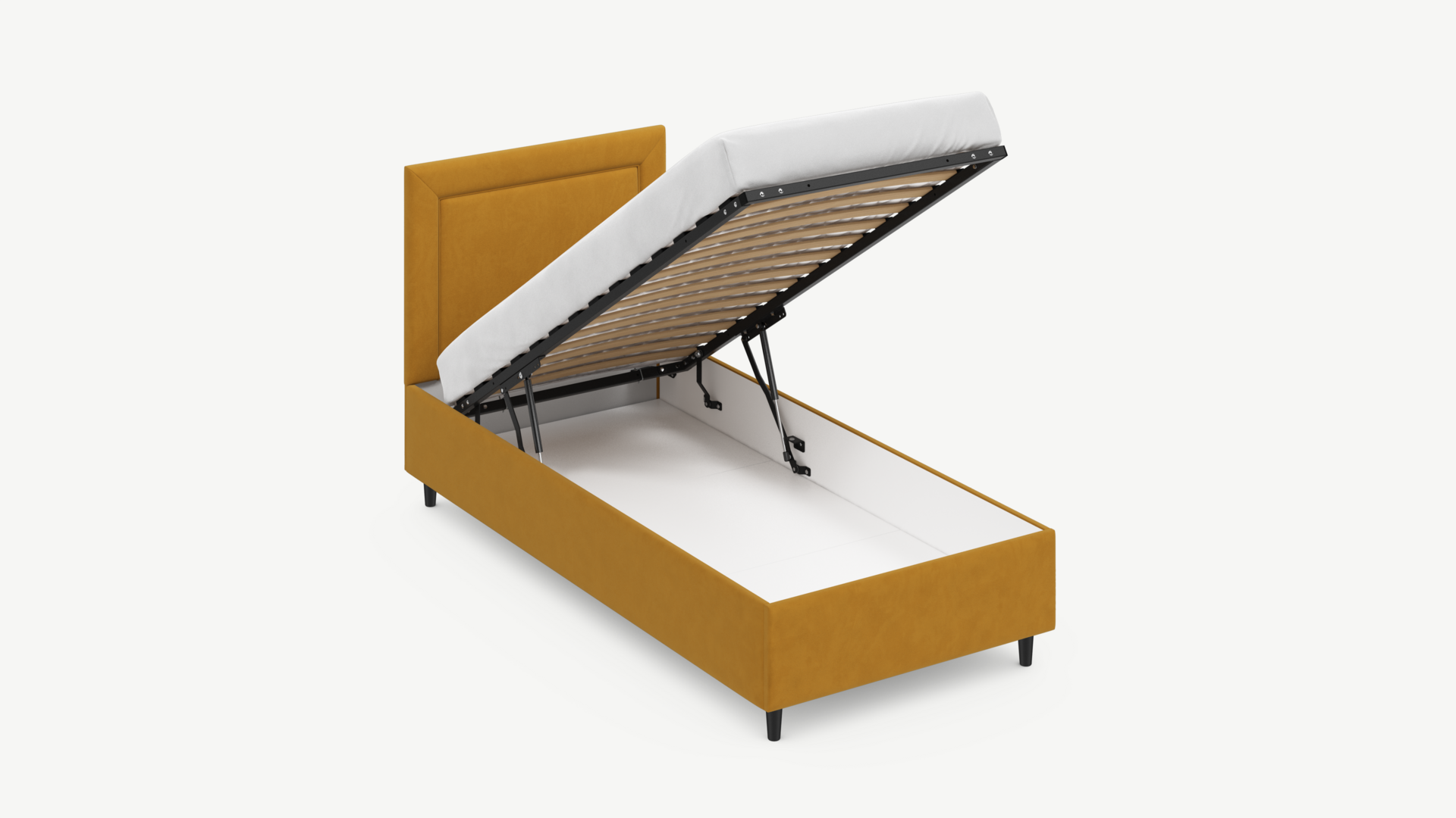 • Скрытая под основанием вместительная емкость без внутренних перегородок позволяет использовать всю площадь подкроватного пространства для хранения вещей.