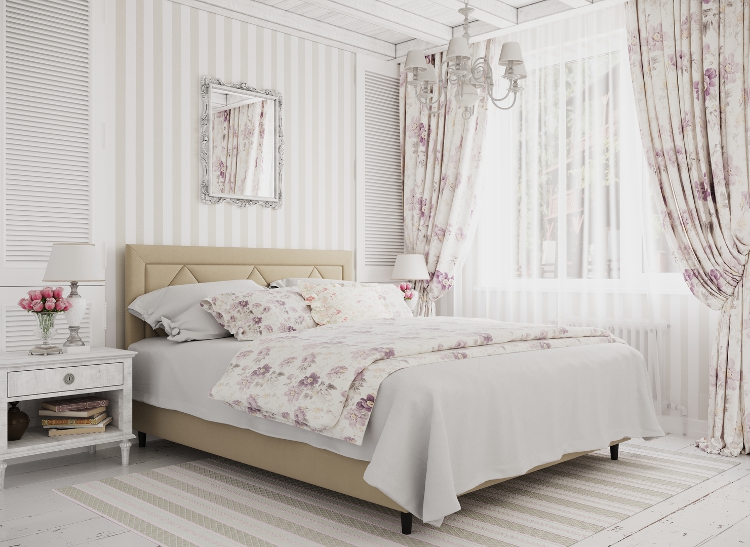 Создать гармоничный интерьер и завершить образ спальни помогут дополнительные аксессуары, например: тумбы, банкетки, подушки.