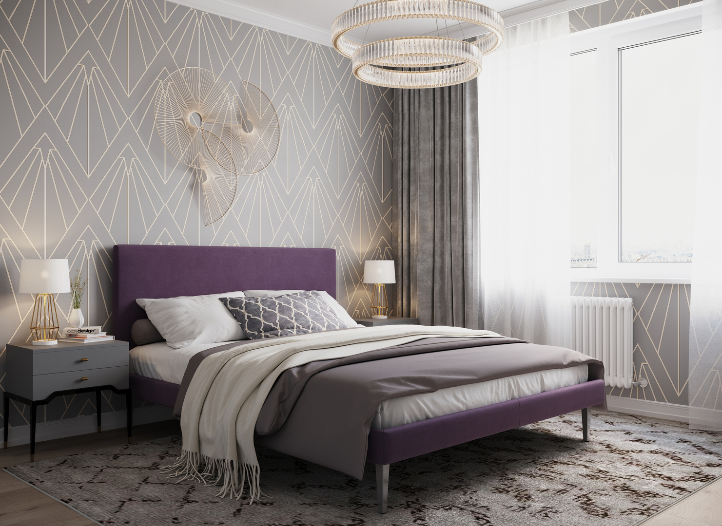 Создать гармоничный интерьер и завершить образ спальни помогут дополнительные аксессуары, например: тумбы, банкетки, подушки.