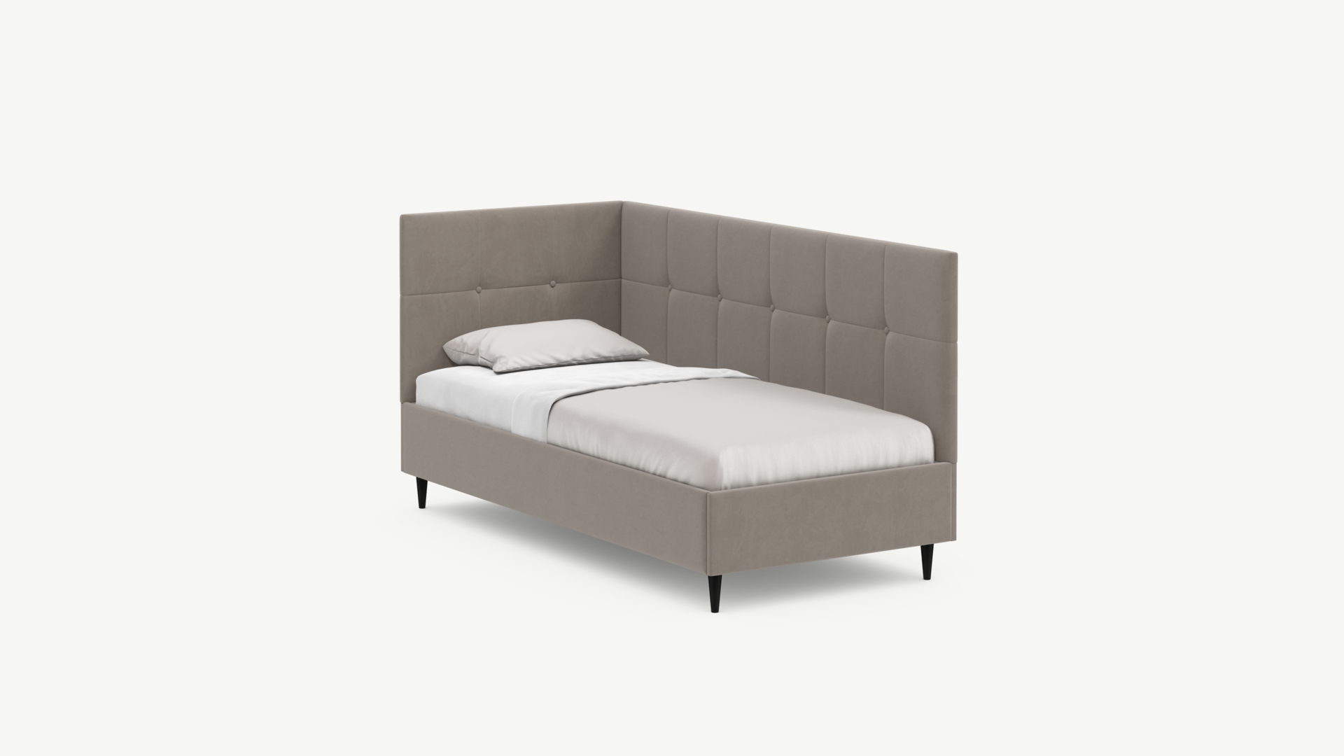 Угловая односпальная кровать MOON FAMILY 1261 с мягкой спинкой и изголовьем создаст в Вашей спальне ощущение уюта. Крупная квадратная стежка привносит в интерьер графических акцентов, а вставка из пуговиц наполняет пространство ощущением домашнего тепла.