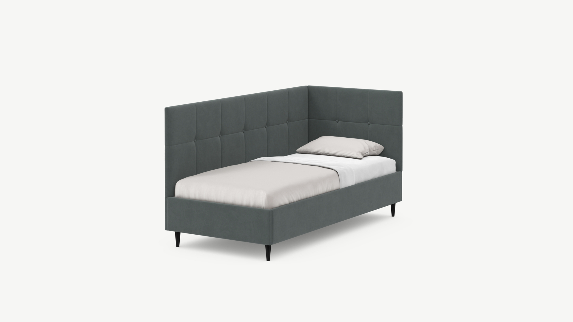 Угловая односпальная кровать MOON FAMILY 1261 с мягкой спинкой и изголовьем создаст в Вашей спальне ощущение уюта. Крупная квадратная стежка привносит в интерьер графических акцентов, а вставка из пуговиц наполняет пространство ощущением домашнего тепла.