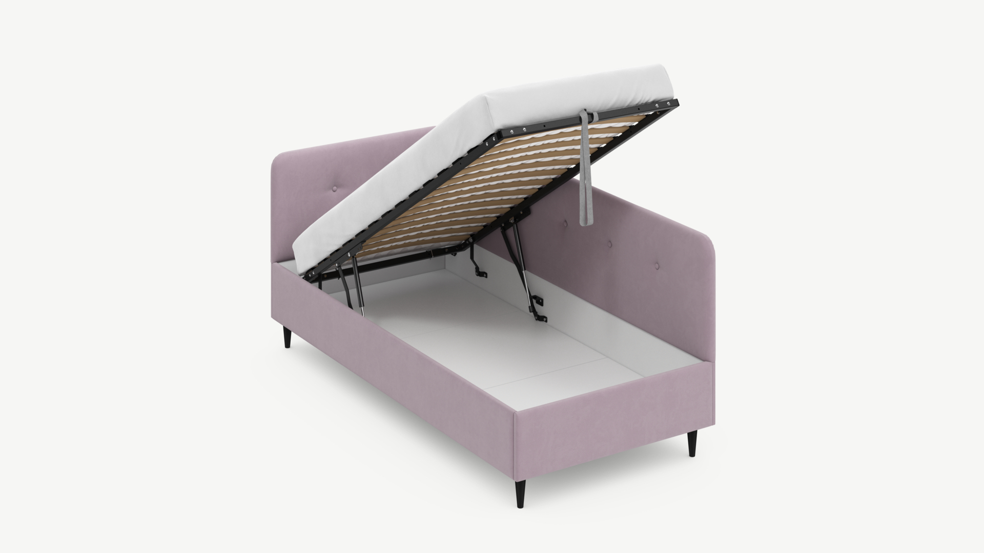 Угловая односпальная кровать MOON FAMILY 1253 с мягкой спинкой и изголовьем обладает округлыми формами, привносящими в интерьер нотки нежности. Изголовье, украшенное пуговицами, добавляет окружающему пространству шарм и уют. Высокие опоры придают кровати визуальной легкости, а также обеспечивают удобство во время уборки.