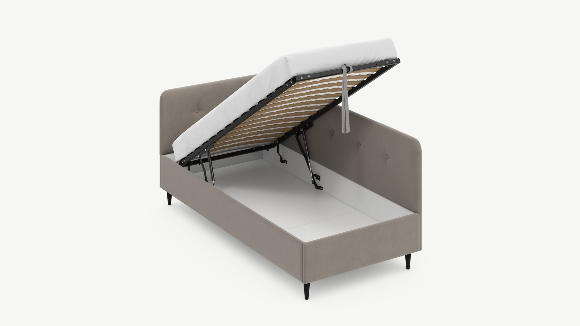 • Скрытая под основанием вместительная емкость без внутренних перегородок позволяет использовать всю площадь подкроватного пространства для хранения вещей.