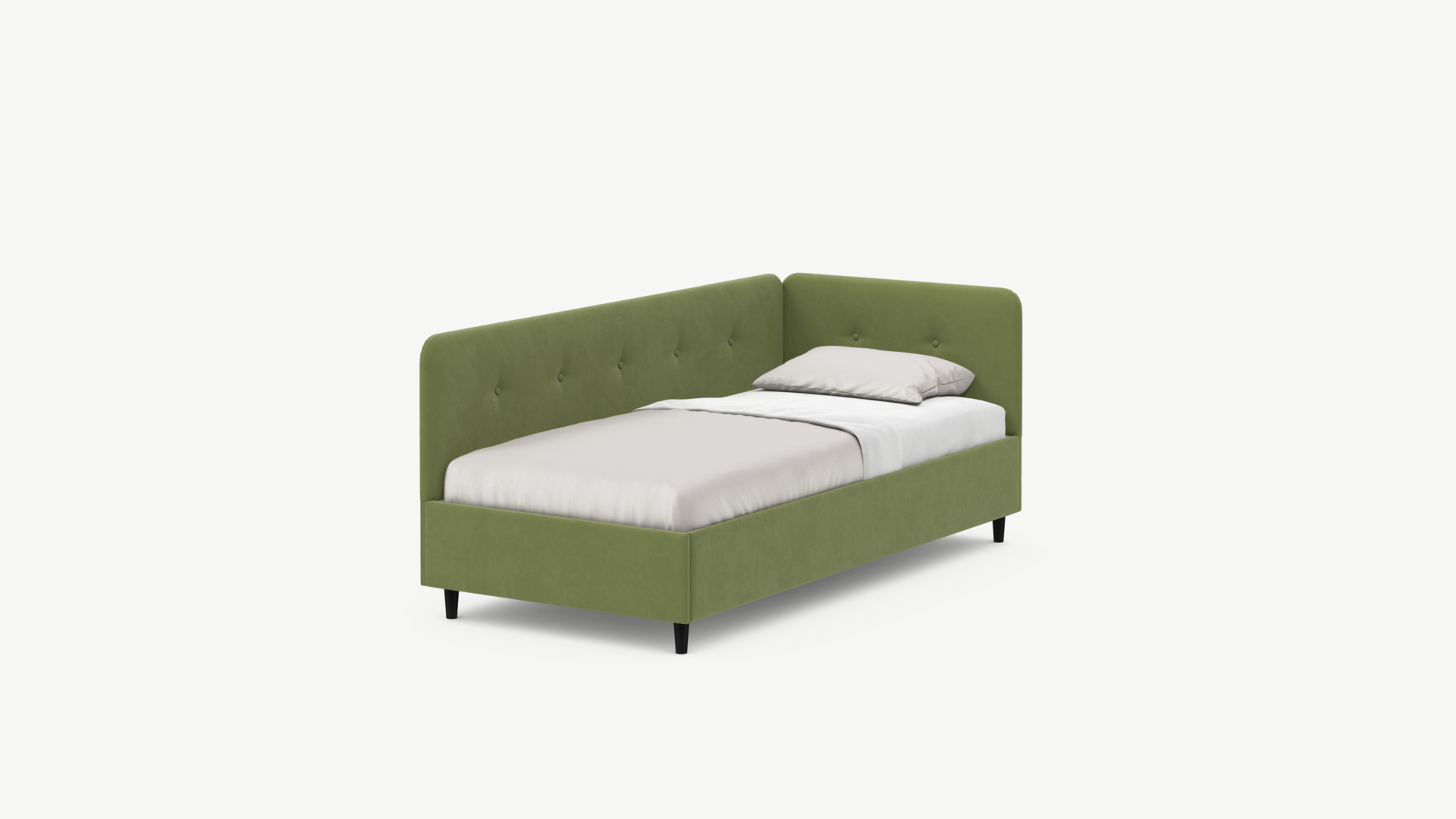 Угловая односпальная кровать MOON FAMILY 1253 с мягкой спинкой и изголовьем обладает округлыми формами, привносящими в интерьер нотки нежности. Изголовье, украшенное пуговицами, добавляет окружающему пространству шарм и уют. Высокие опоры придают кровати визуальной легкости, а также обеспечивают удобство во время уборки.