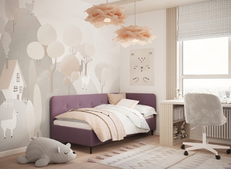 Угловая односпальная кровать MOON FAMILY 1253 с мягкой спинкой и изголовьем обладает округлыми формами, привносящими в интерьер нотки нежности. Изголовье, украшенное пуговицами, добавляет окружающему пространству шарм и уют. Высокие опоры придают кровати визуальной легкости, а также обеспечивают удобство во время уборки.