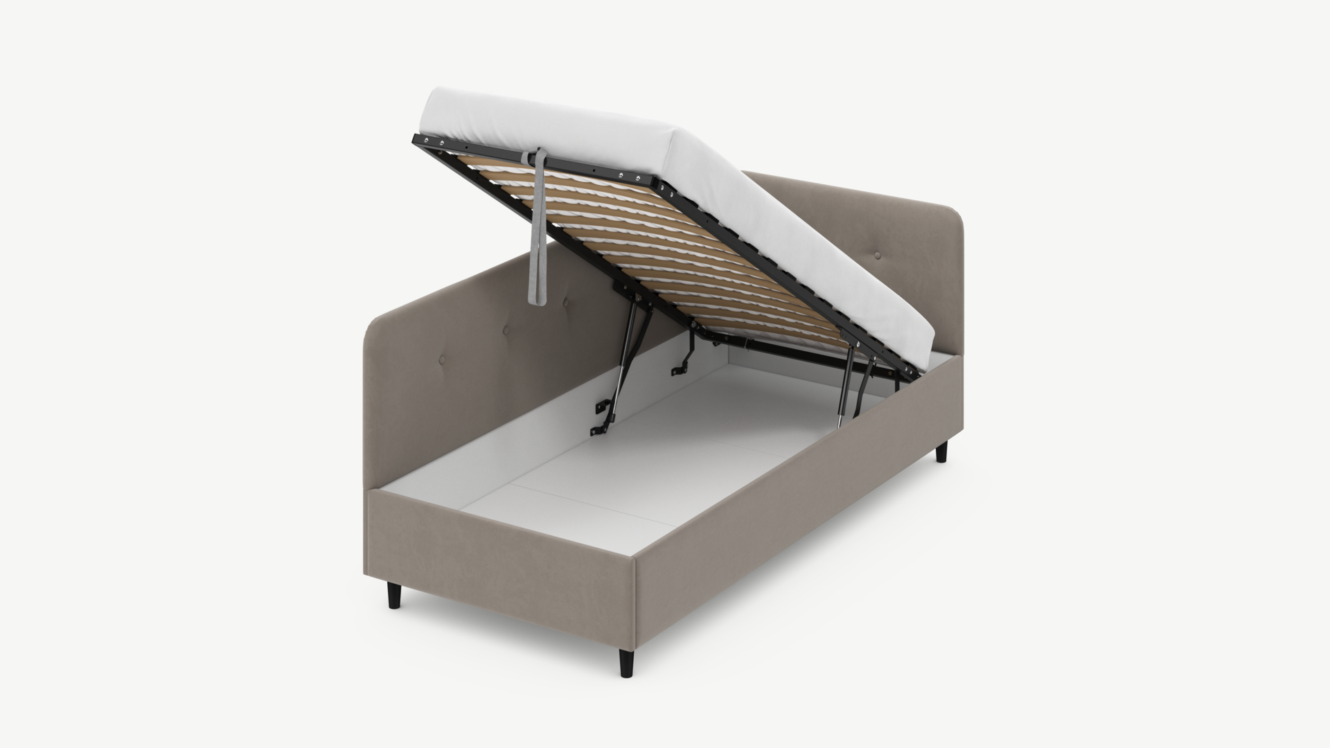 - Скрытая под основанием вместительная емкость без внутренних перегородок позволяет использовать всю площадь подкроватного пространства для хранения вещей.
