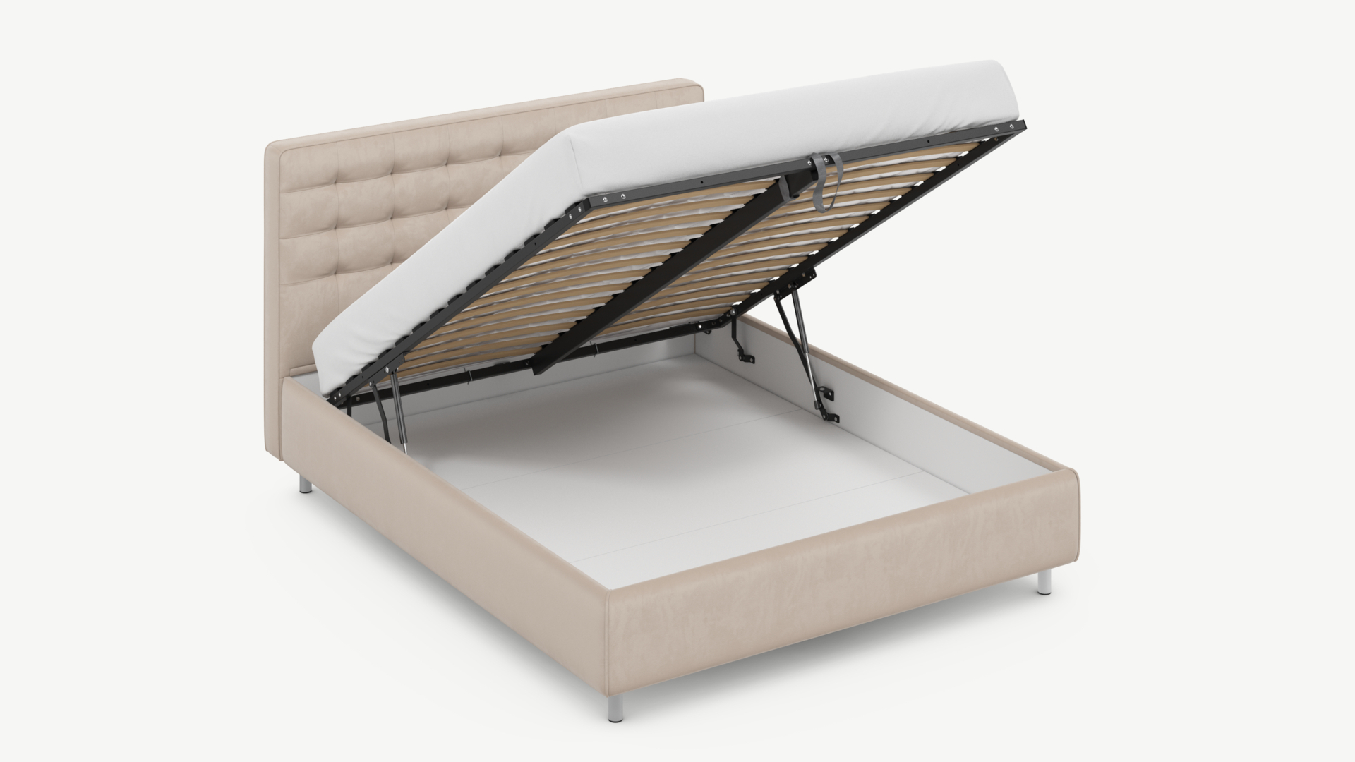 - Скрытая под основанием вместительная емкость без внутренних перегородок позволяет использовать всю площадь подкроватного пространства для хранения вещей.
