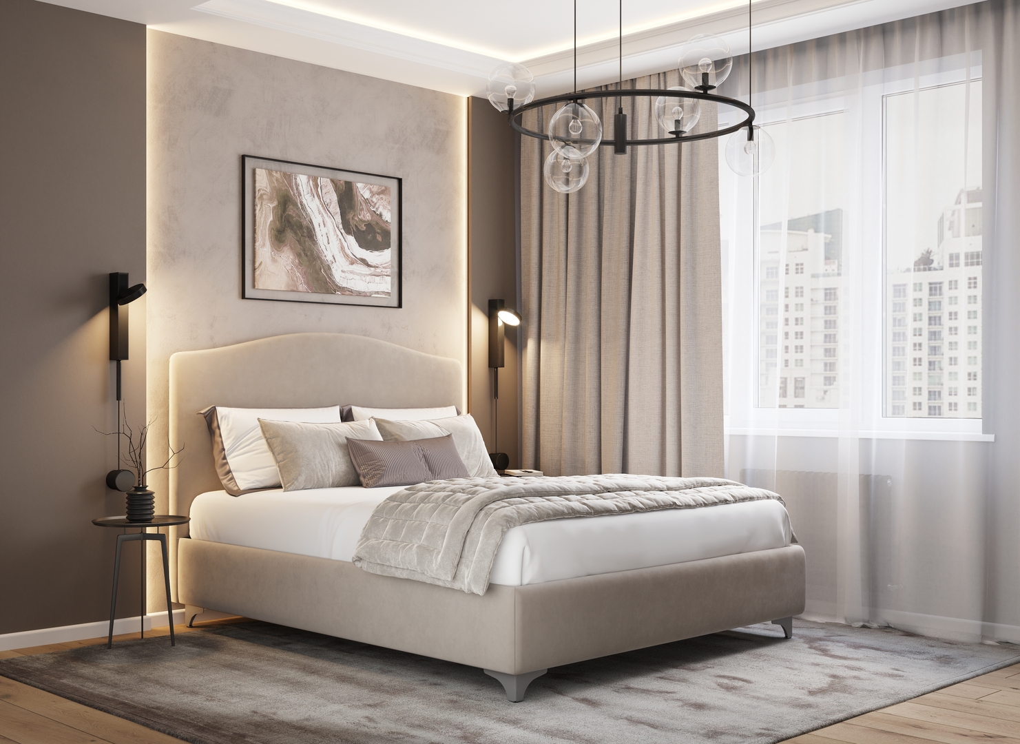 Разнообразие цветовой палитры позволит подобрать желаемый оттенок обивочного материала. Использование светлых цветов поддержит настроение стиля «Сканди». Нейтральные оттенки в цвет интерьера обыграют спальню в Современном стиле.